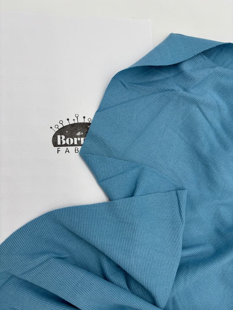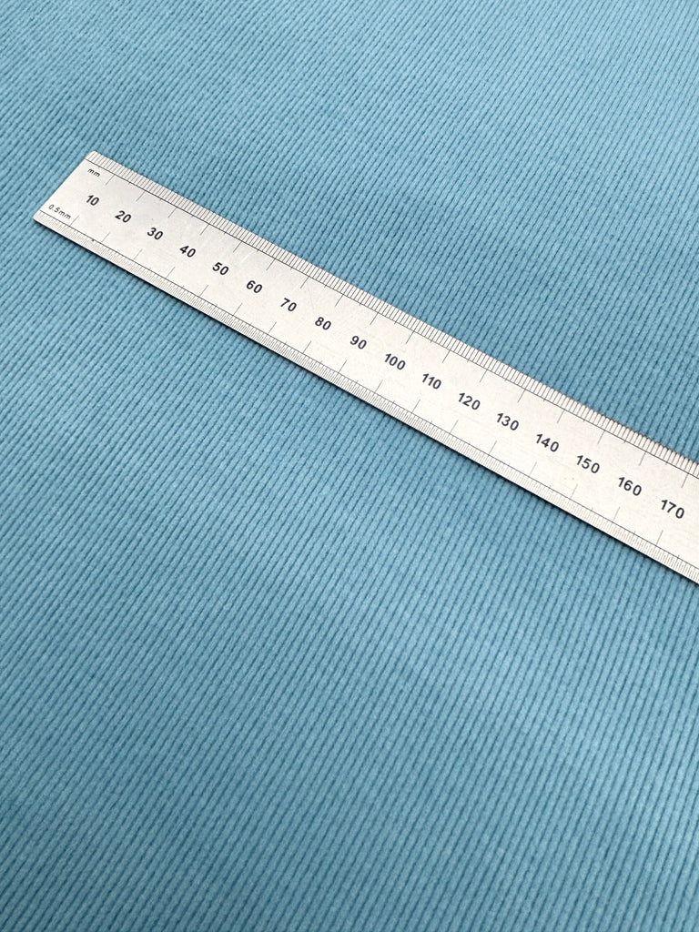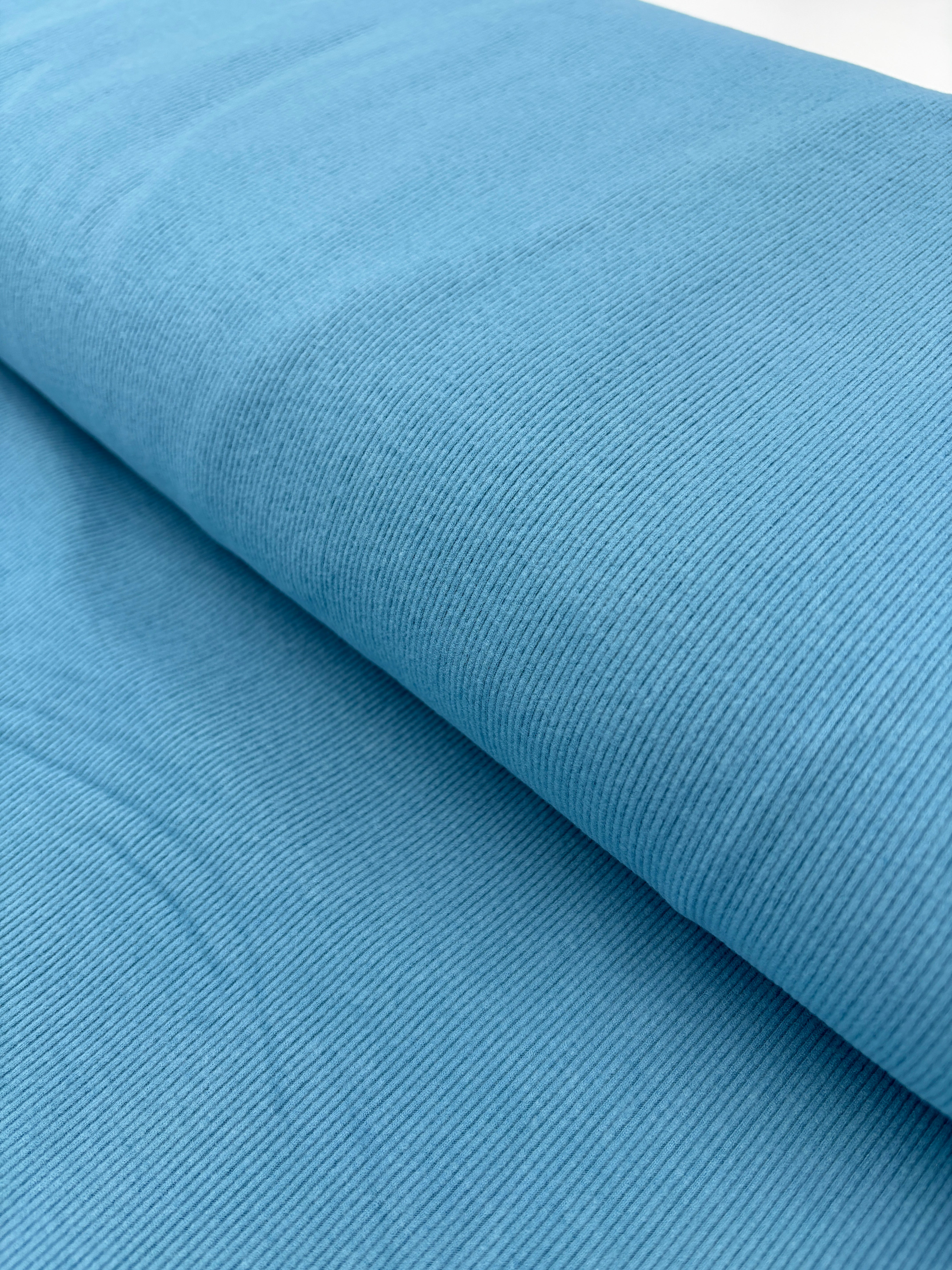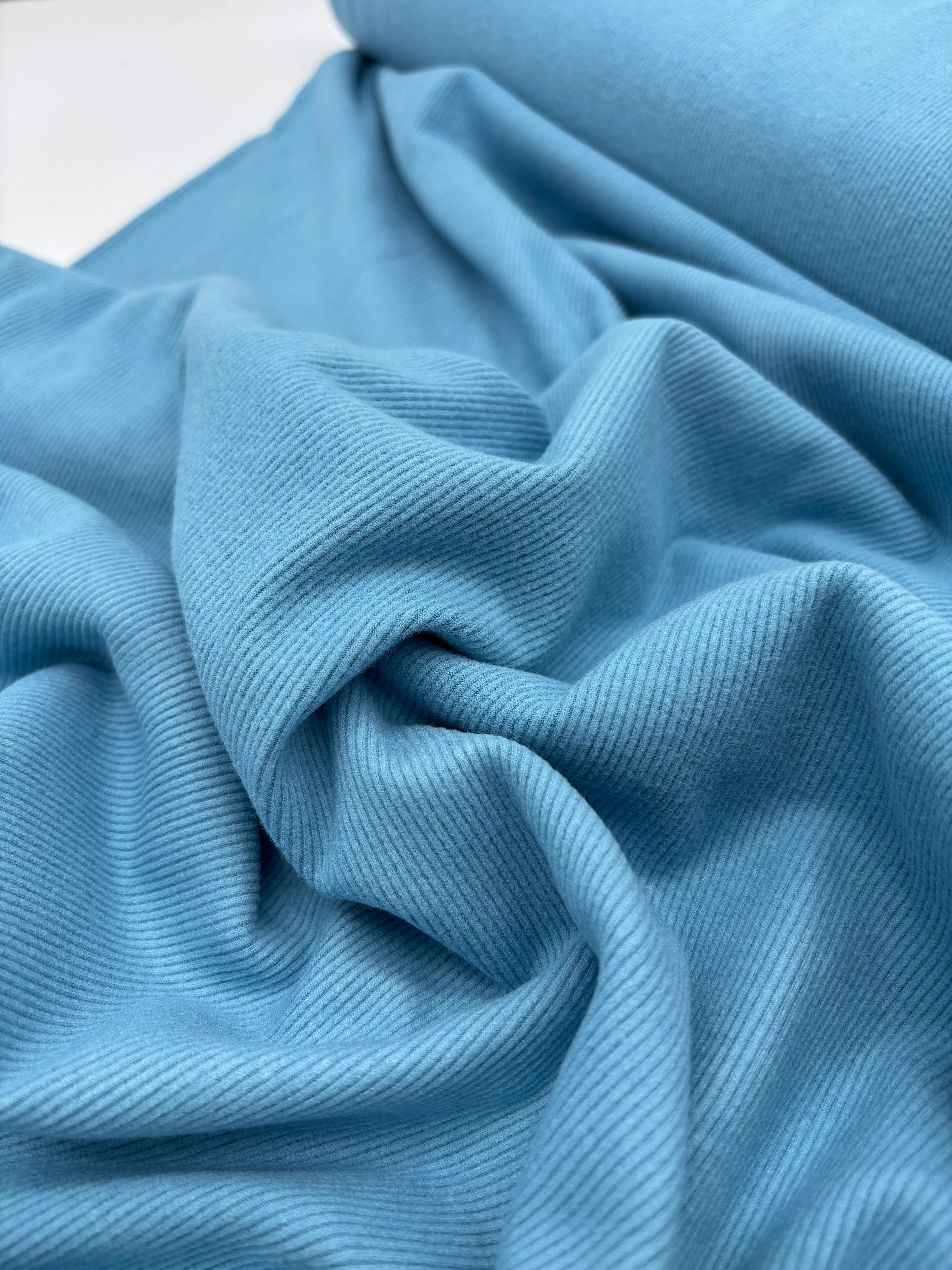 The softest jersey around in a delicate delphinium blue shade. It is unbelievably tactile as it has been brushed on both sides of the fabric to give it a slightly fuzzy texture. The downside of being an online shop is that you need to feel to believe, but you can always take advantage of our swatch service. The fabric has subtle vertical ribs running along the length of the cloth - there are approximately 16 ribs per inch. As it's very stretchy (and did I mention soft?) it would make a fantastic base layer.