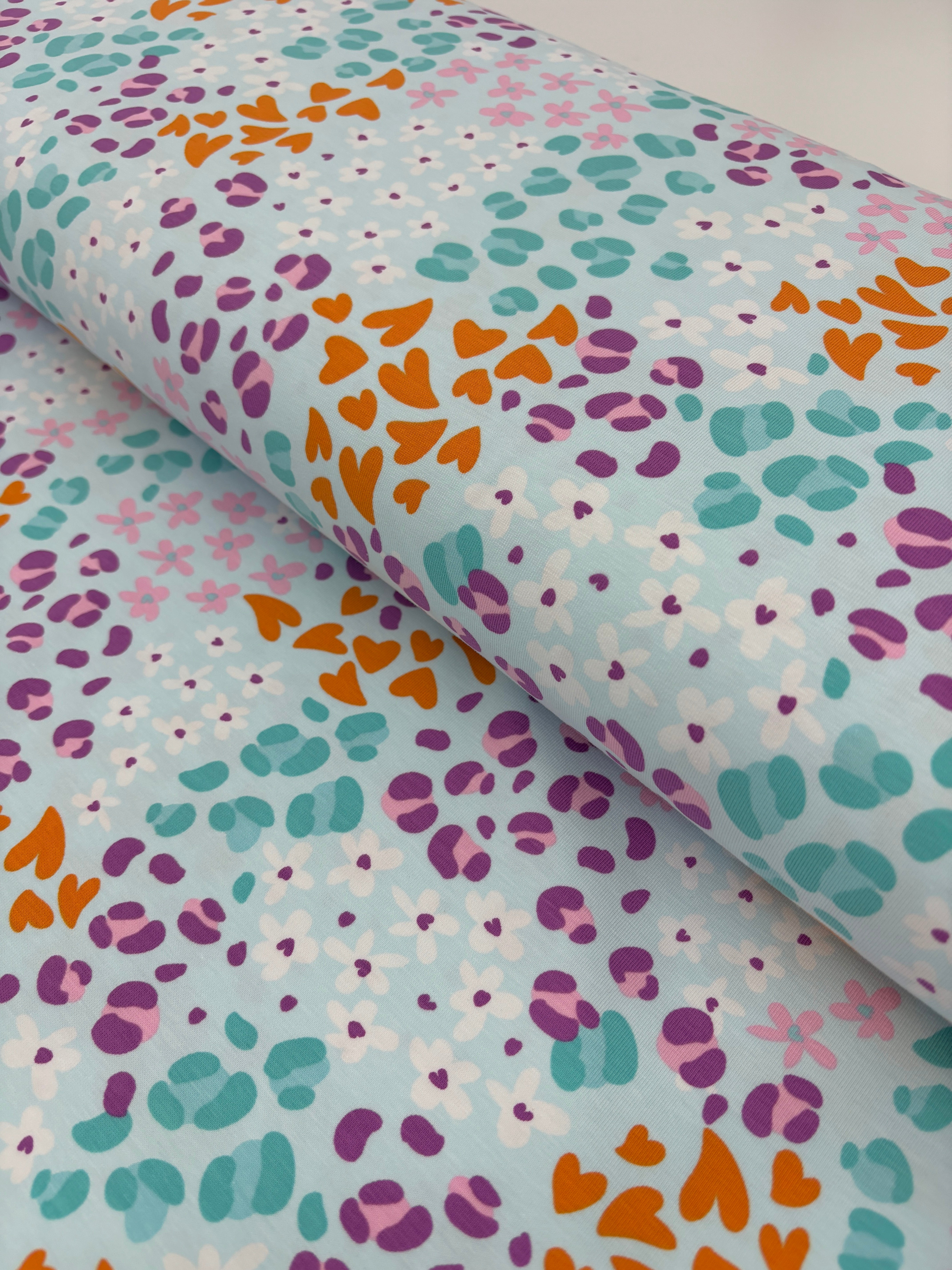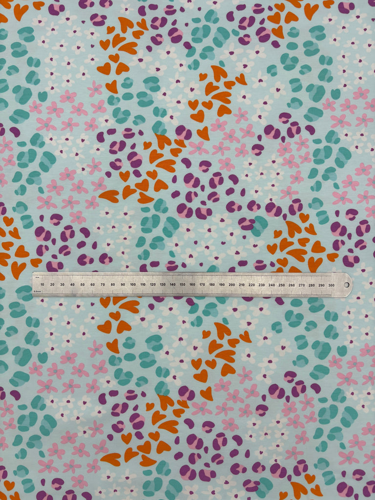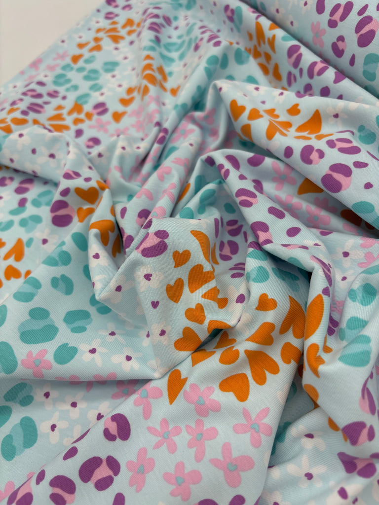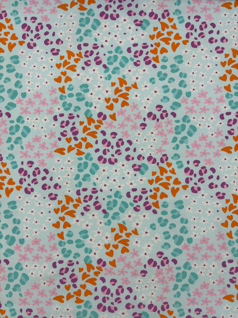 Okay okay, There's a lot going on with this jersey but I'm completely onboard with it all! The pale blue background is a lovely foil for the orange hearts, leopard spots in multiple shades of green and purple, and flowers in white and pink. It's a charming print which will be super versatile.