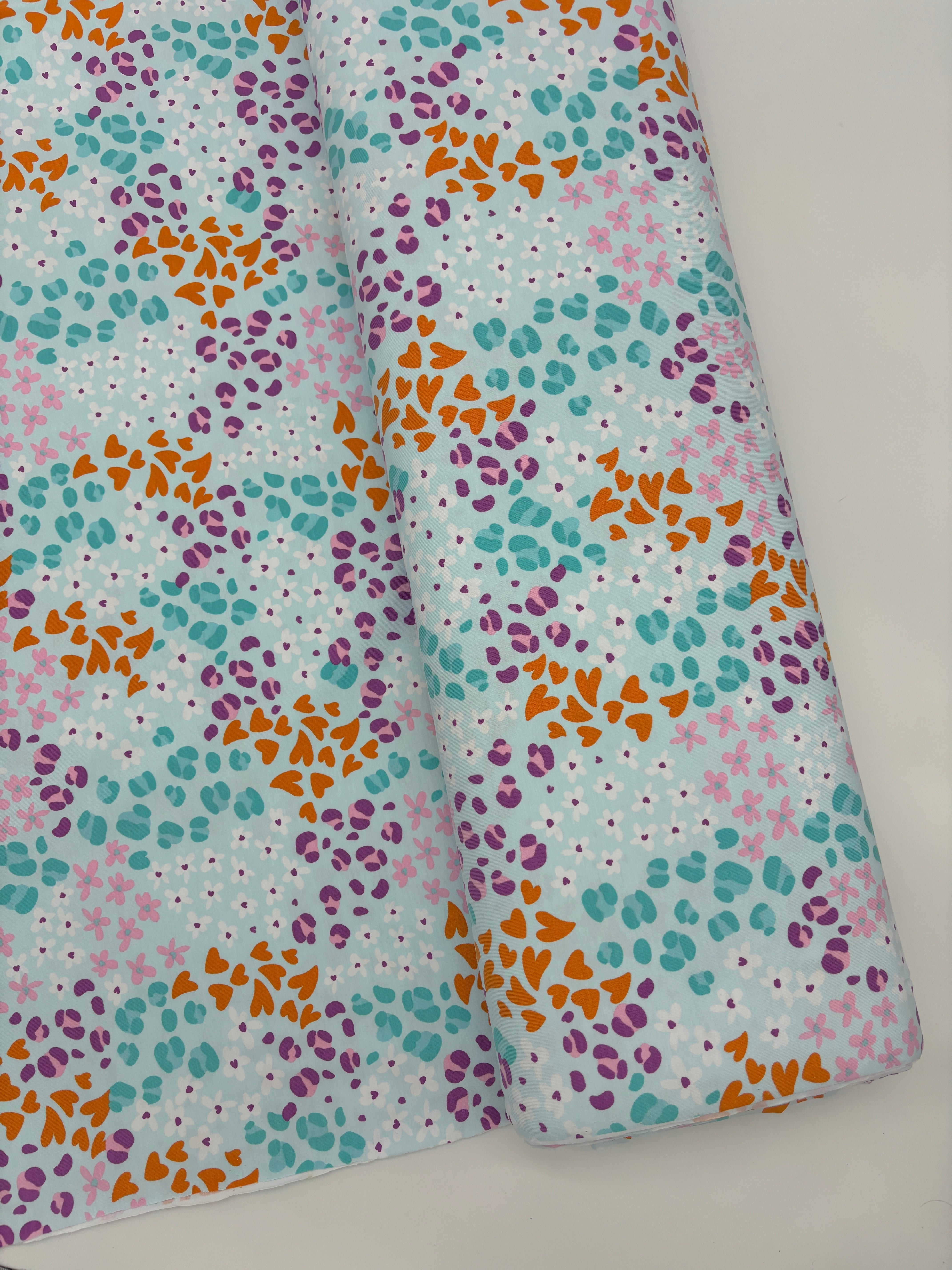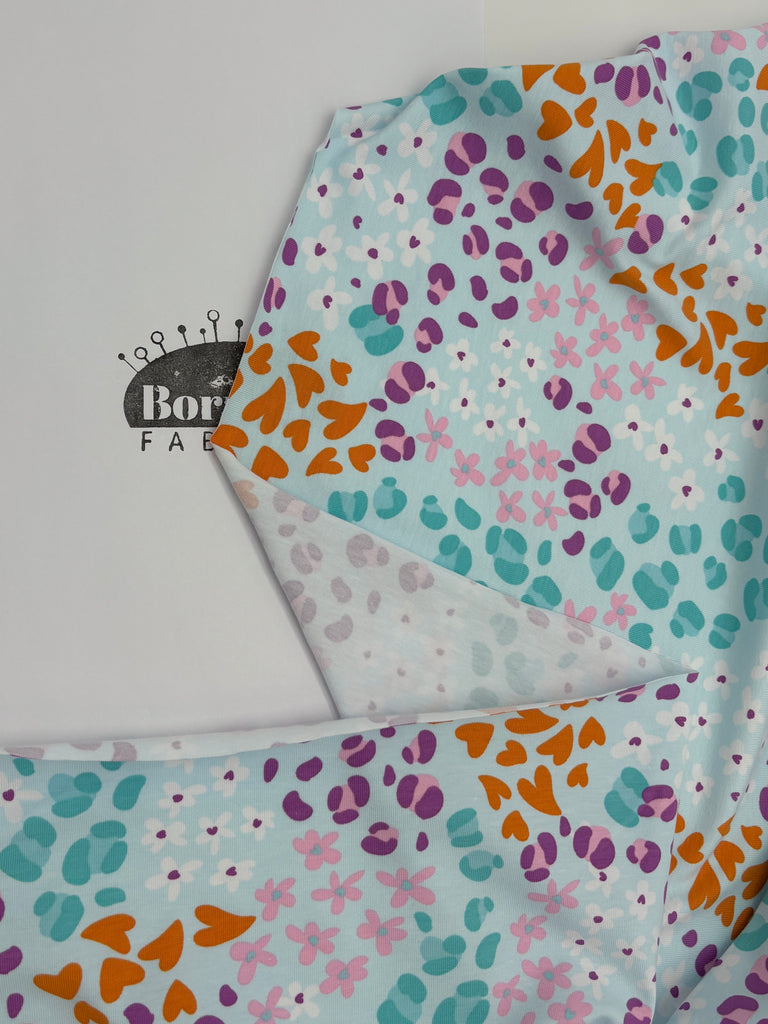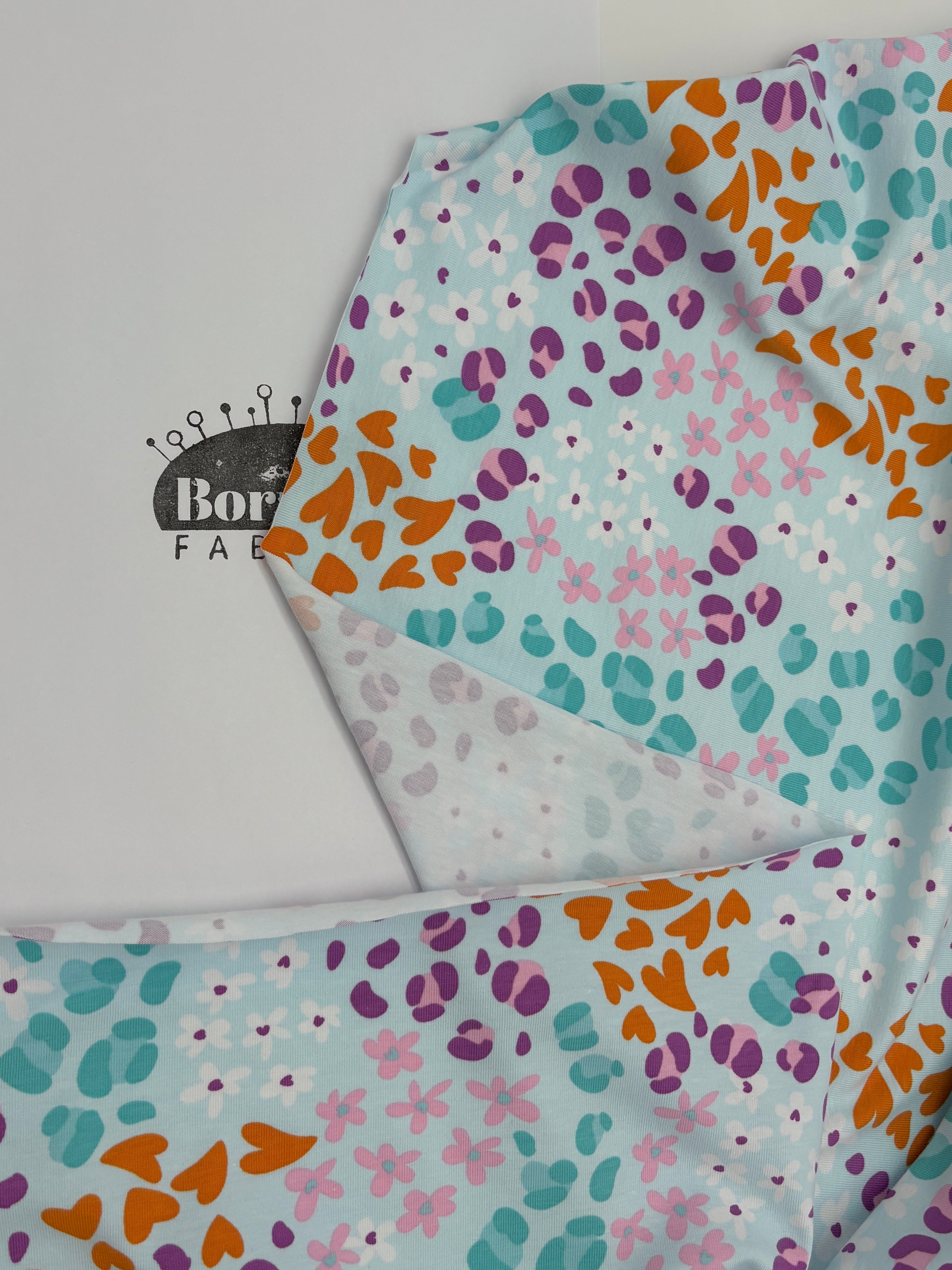 Okay okay, There's a lot going on with this jersey but I'm completely onboard with it all! The pale blue background is a lovely foil for the orange hearts, leopard spots in multiple shades of green and purple, and flowers in white and pink. It's a charming print which will be super versatile.