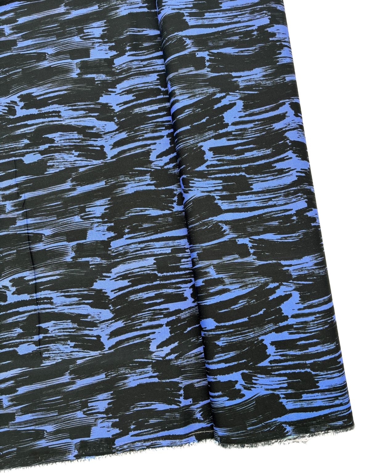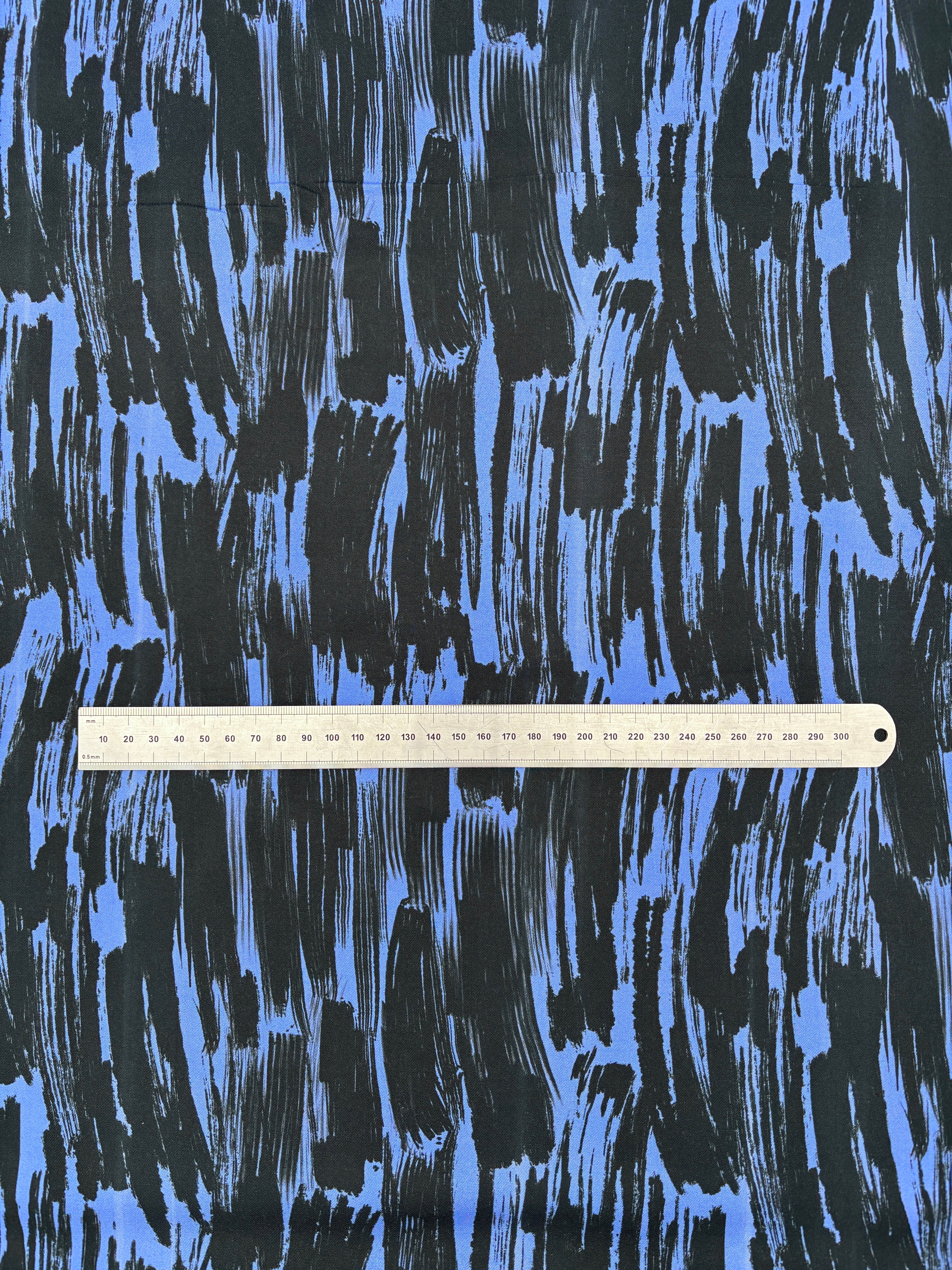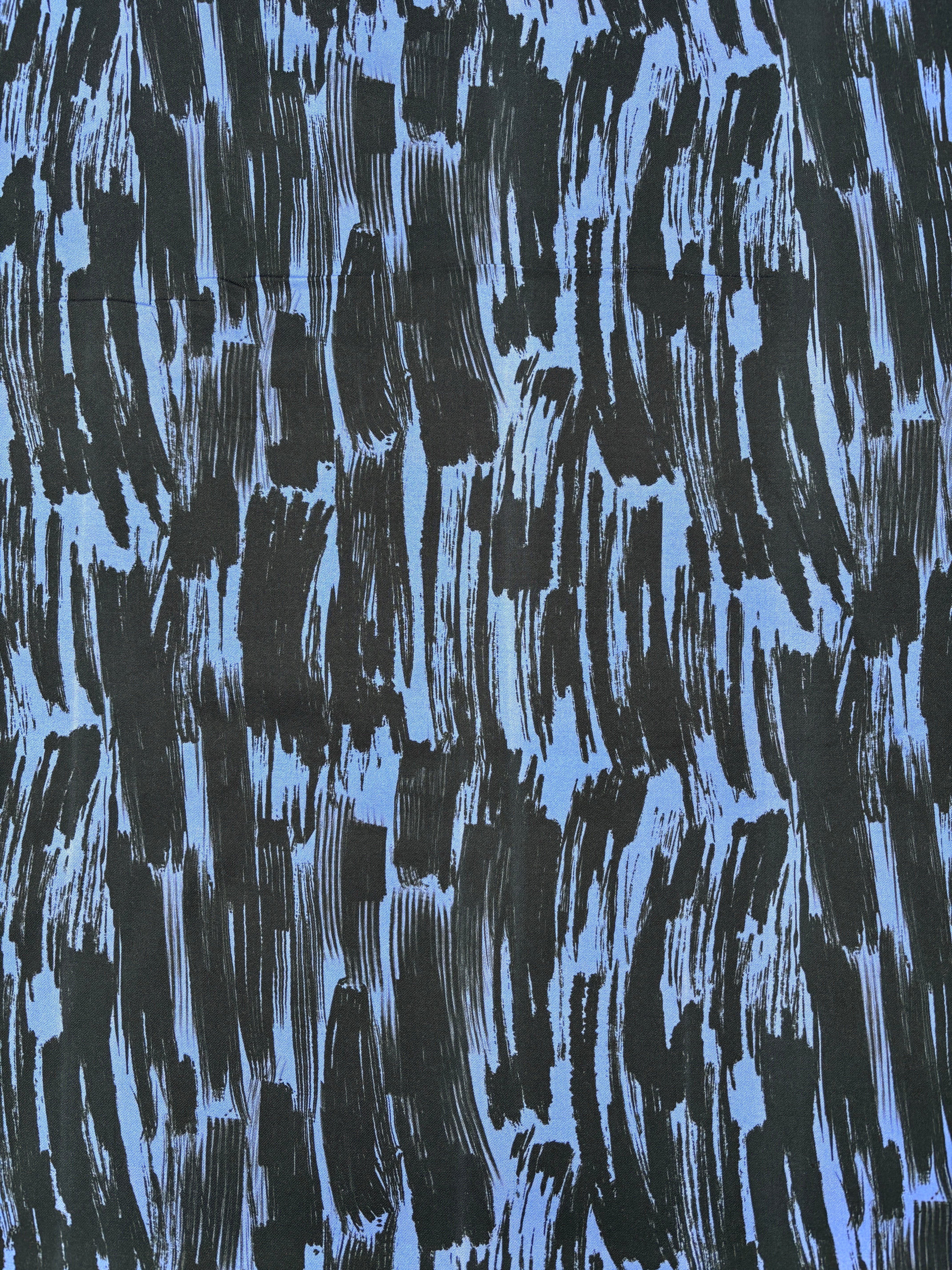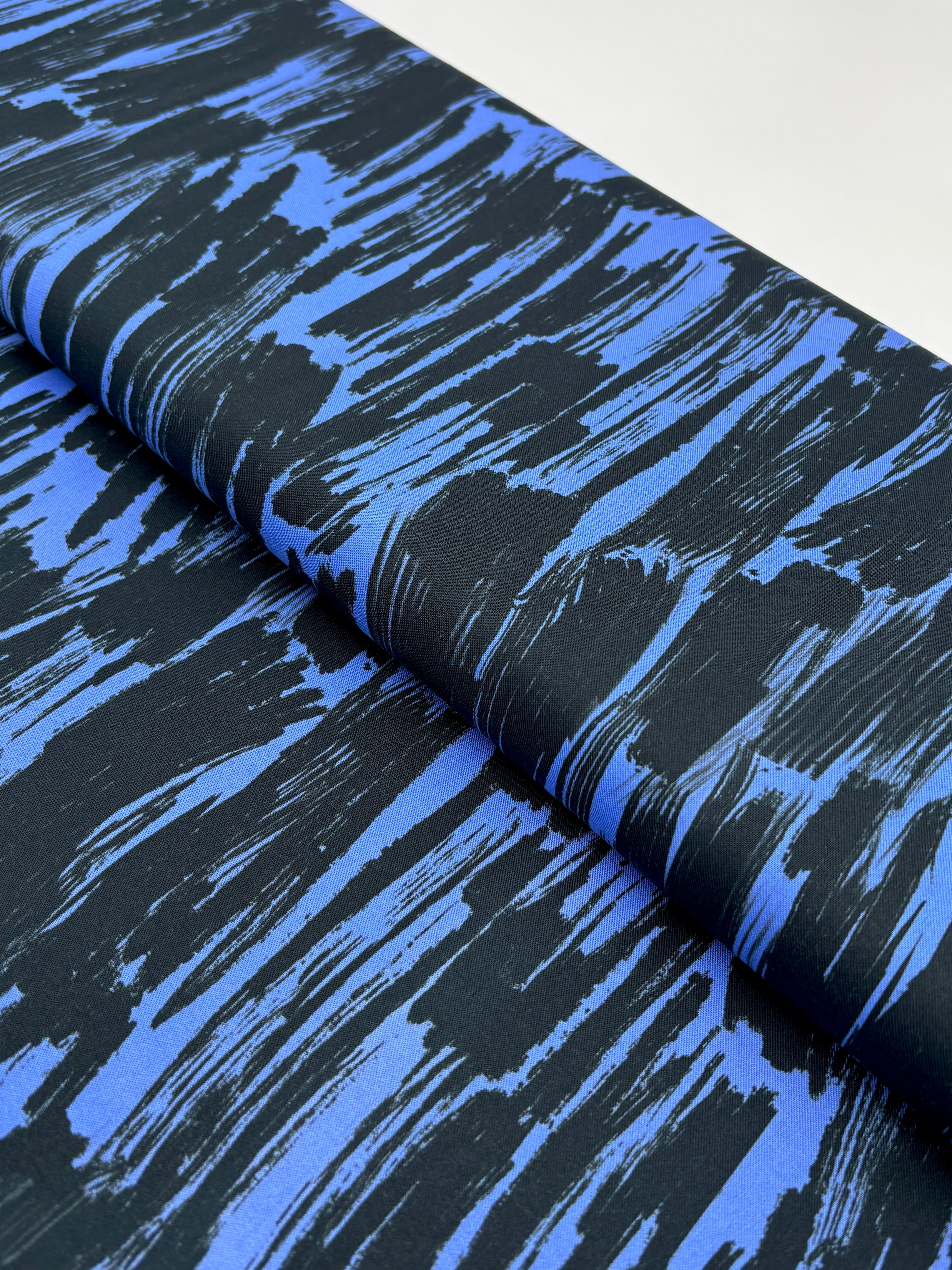 A super cloth with a little bit of comfort stretch. This fabric is a lovely mix of deep blue with black brushstrokes giving it a loose, painterly feel. It's a really elegant cloth which will lend itself to lots of garments - it's the sort of fabric you could dress up or down, depending on your mood.