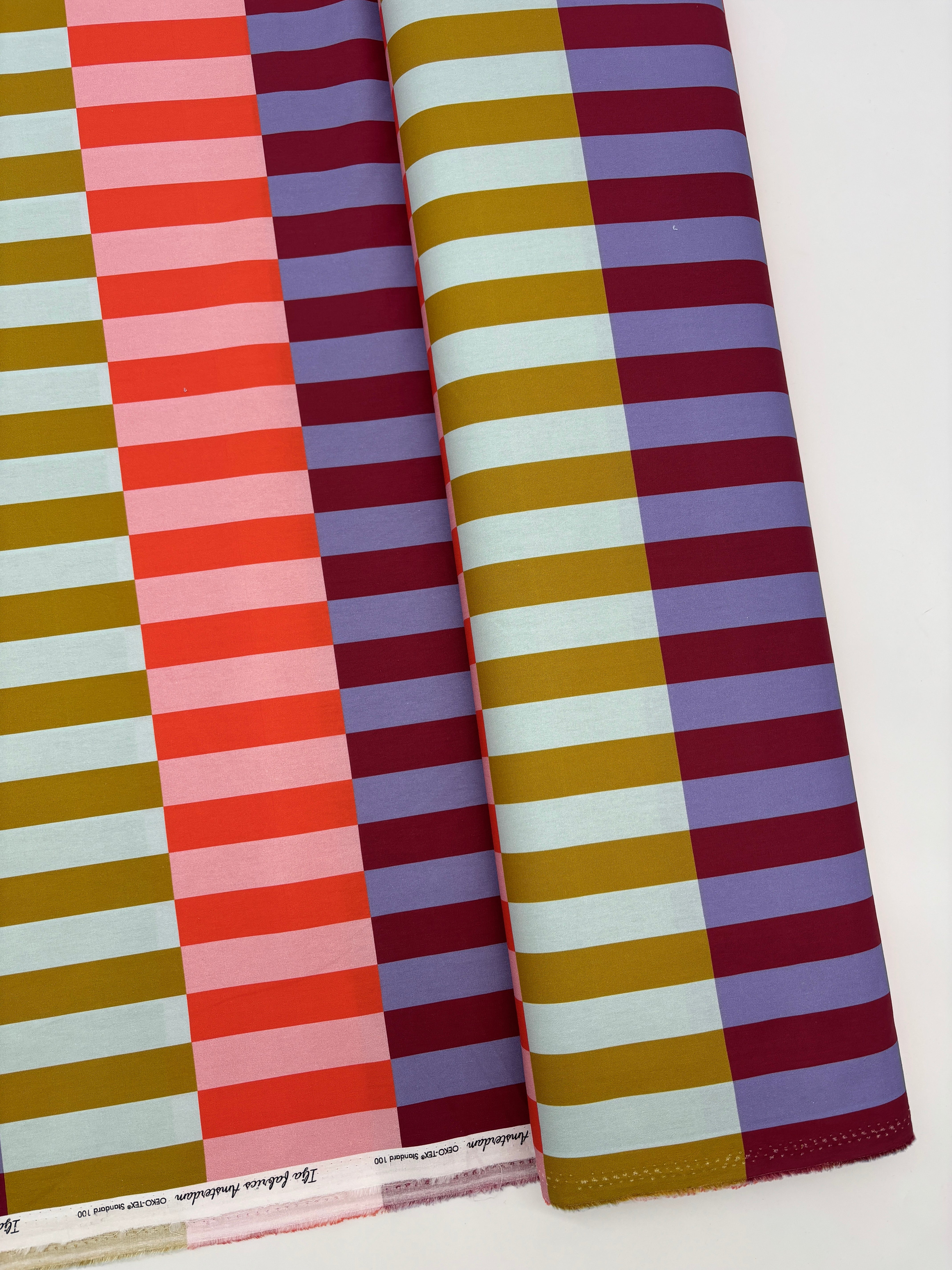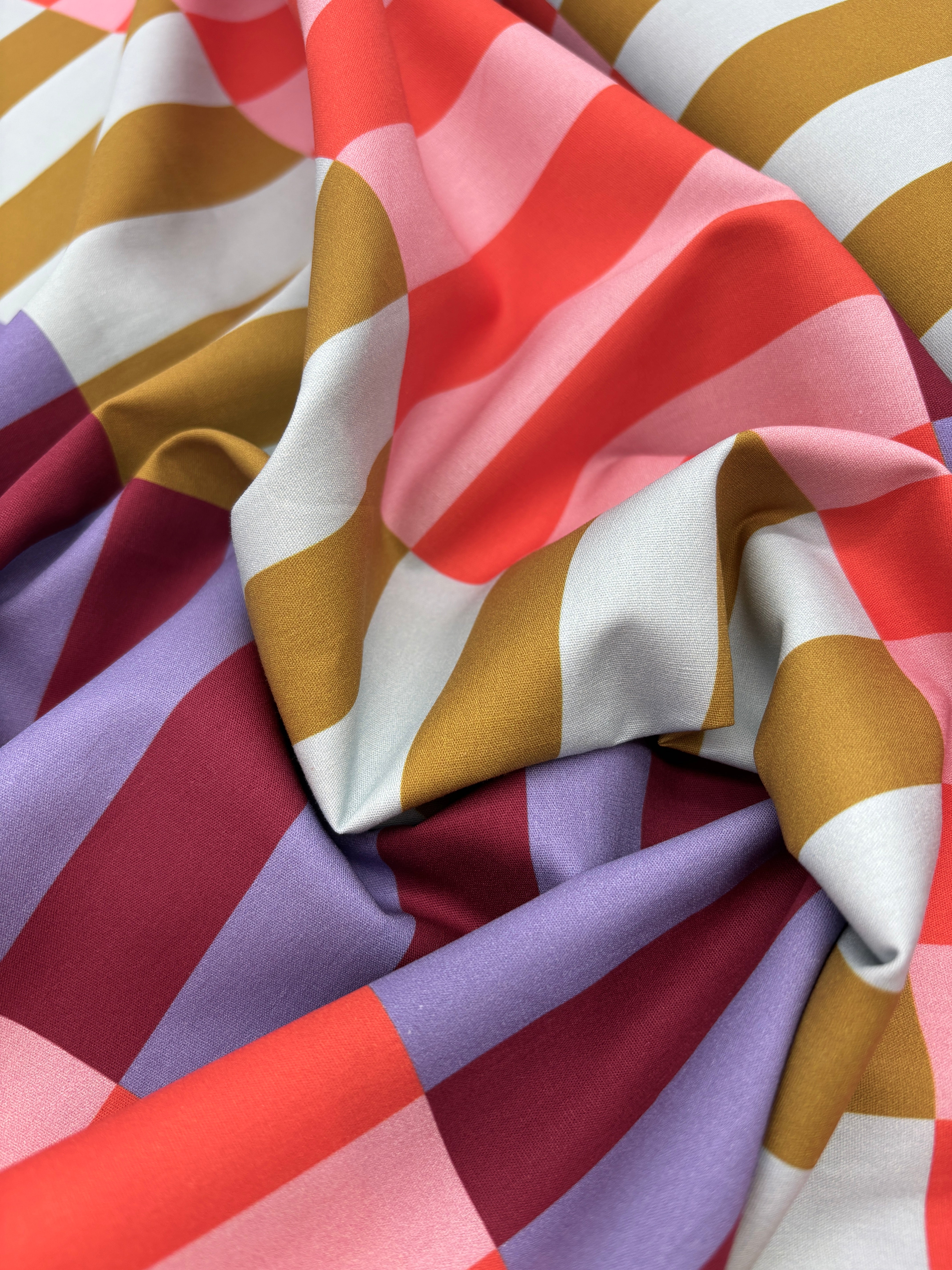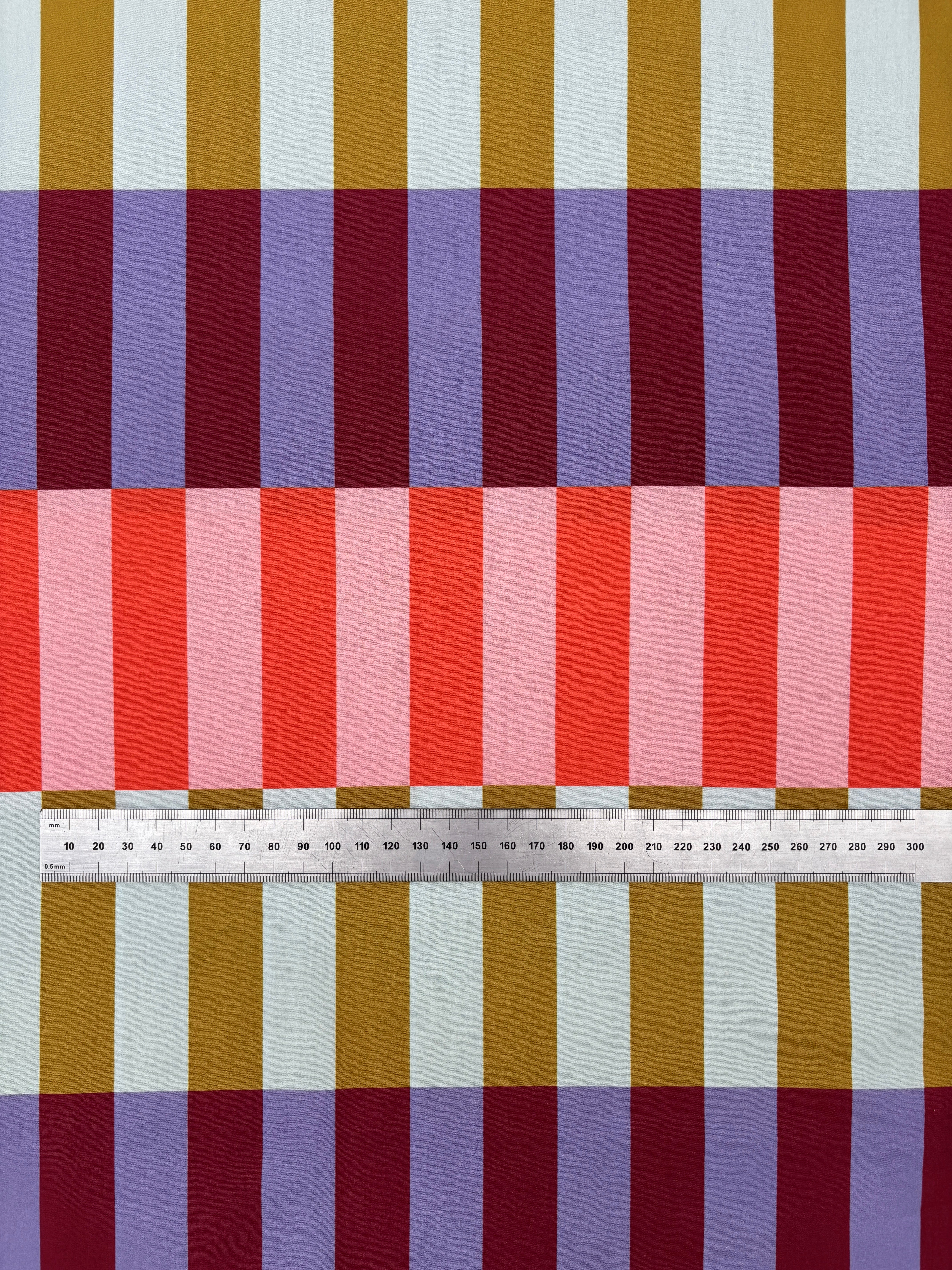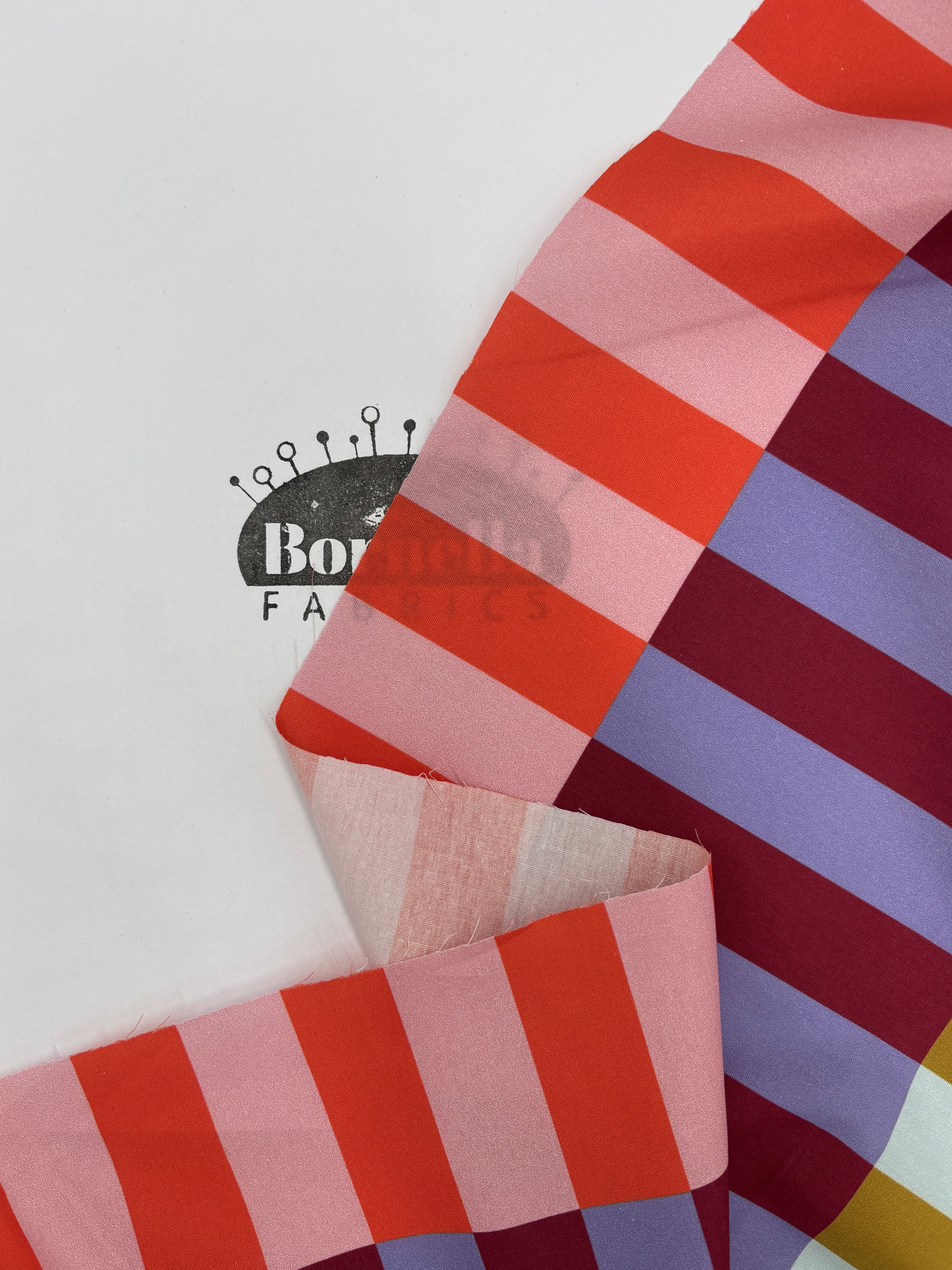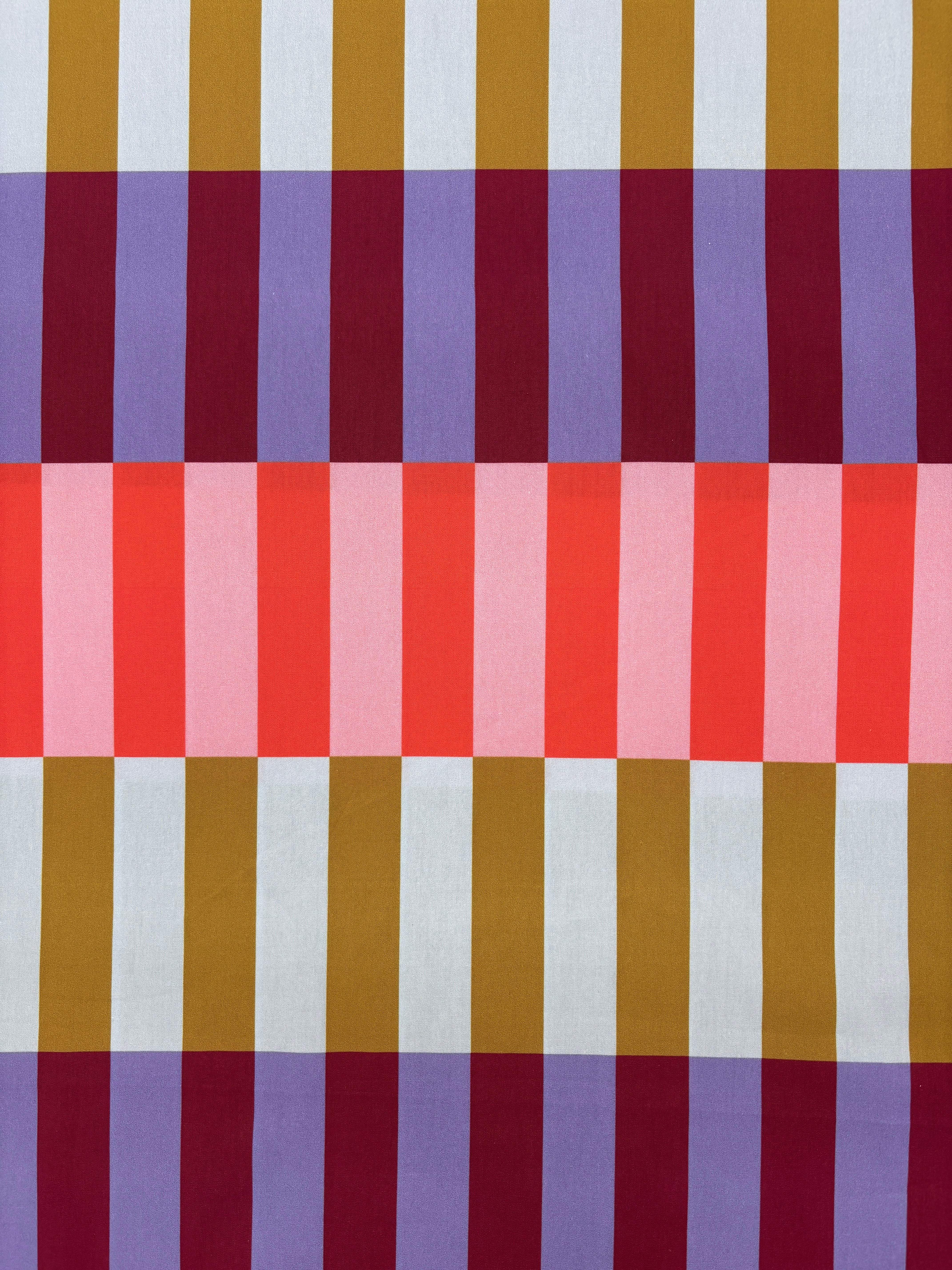A fabulous cotton poplin with a fresh attitude. It has a quirky colourway with stripes of paired colours - peach and orange, chartreuse and ice blue, burgundy and lilac. They look so unique against each other that it's a stand out cloth - you can have an awful lot of fun with this fabric! The rectangles are approximately 7.5cm x 2.5cm???.