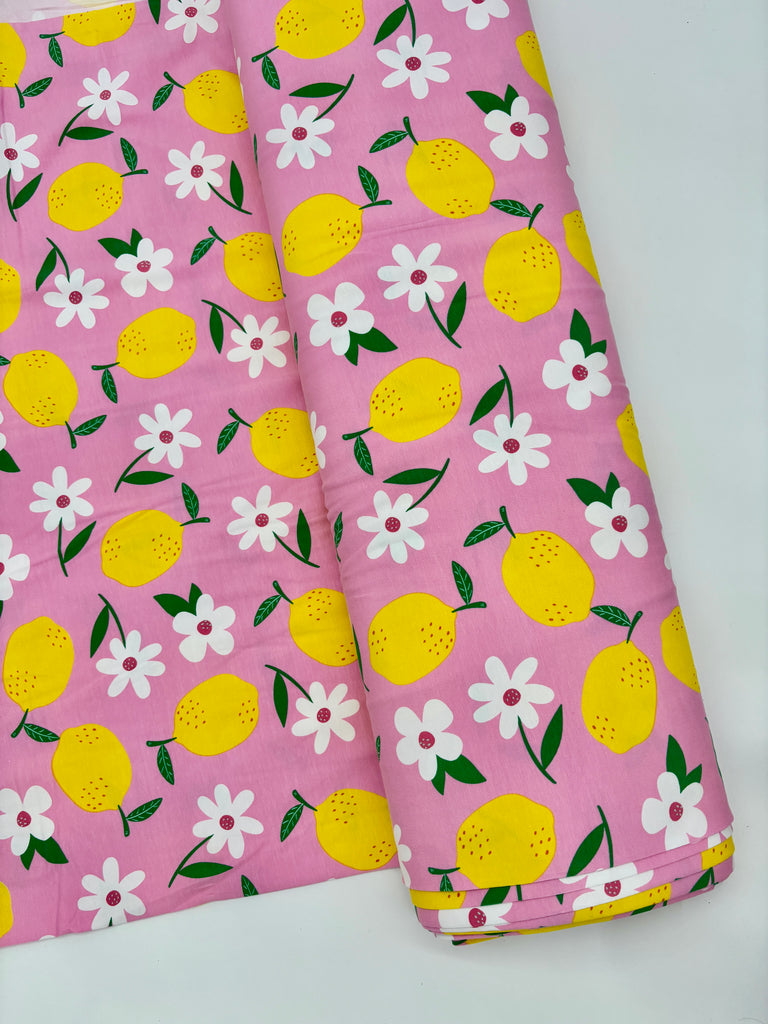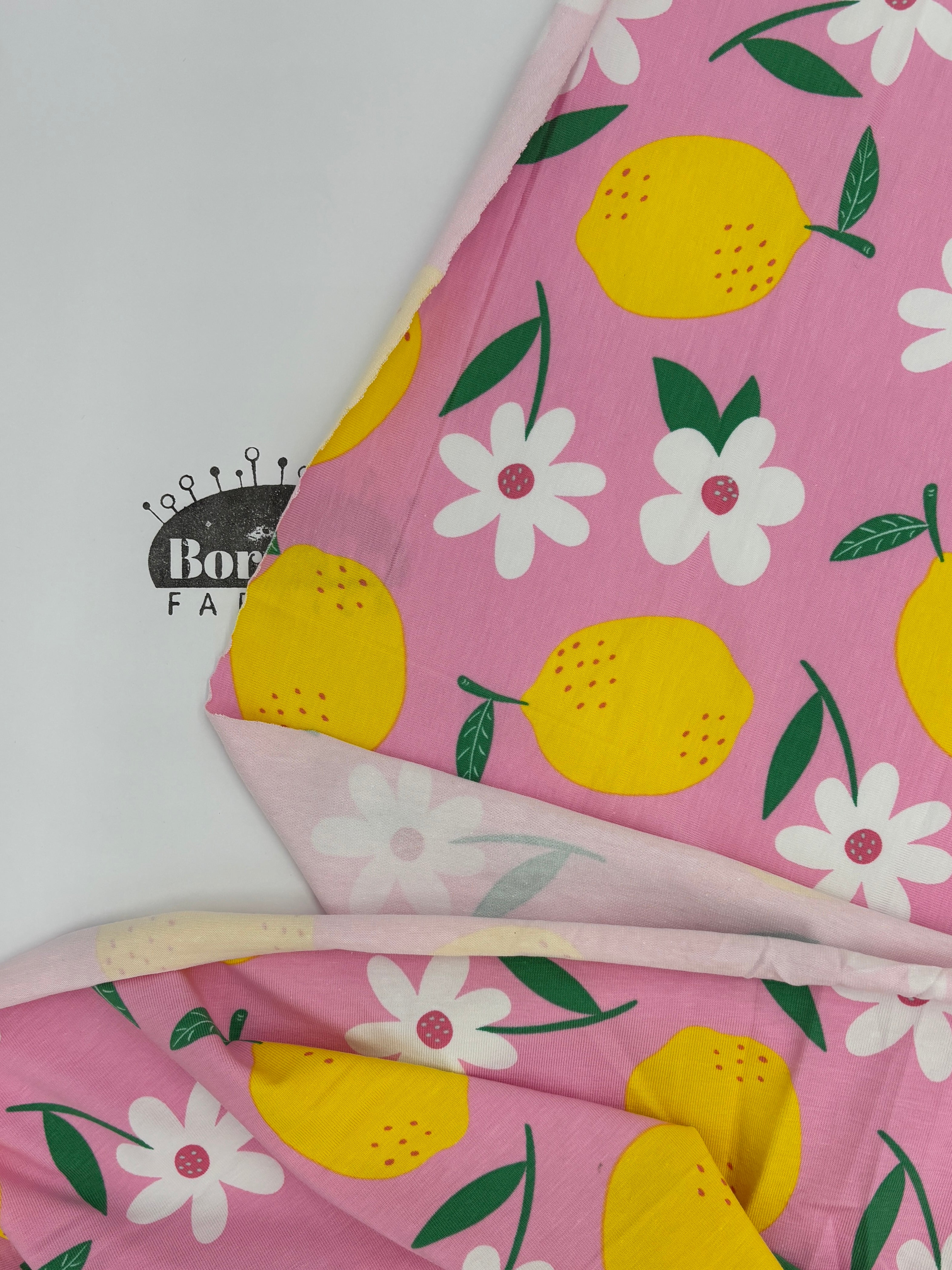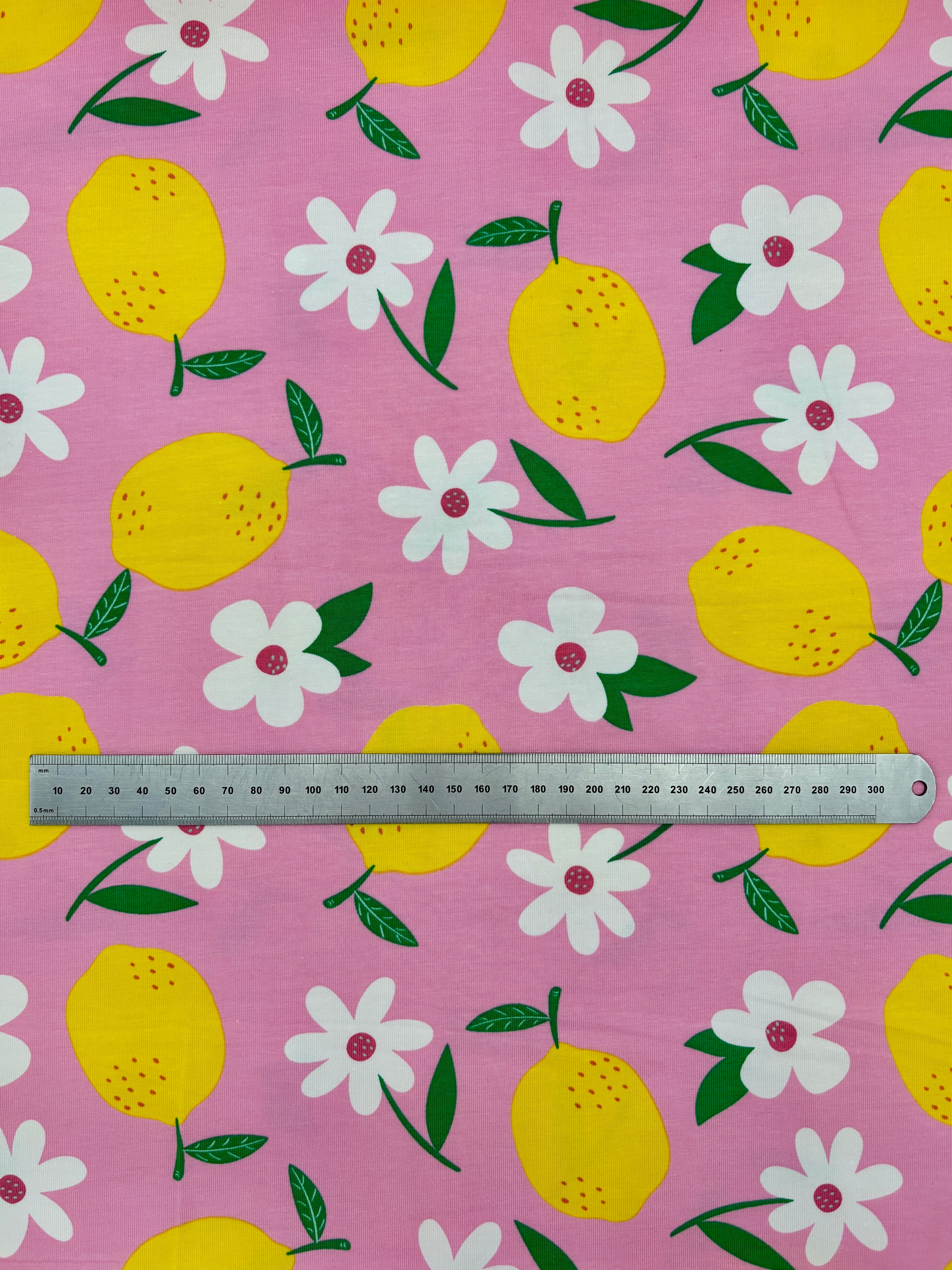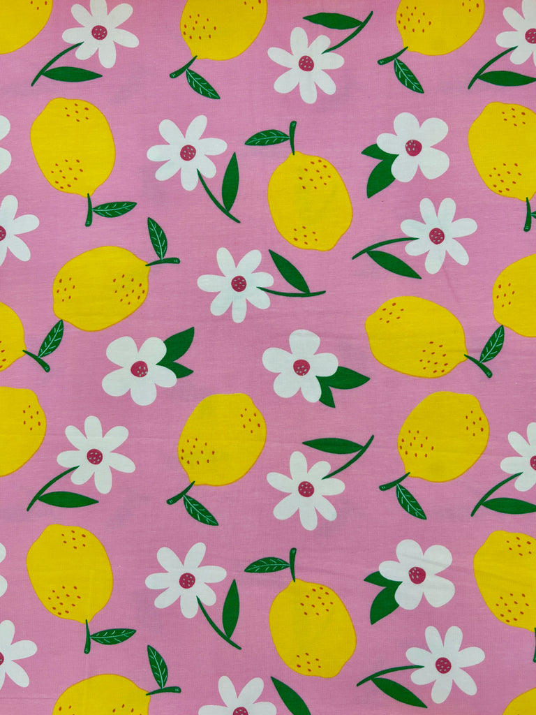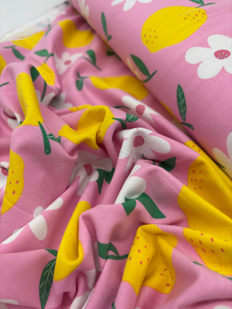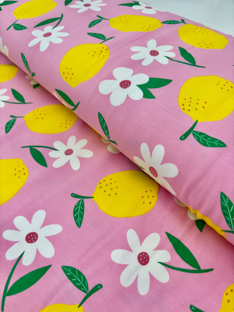 A bold and bright cotton jersey with graphic lemons and lemon blossoms. It almost looks like a collage with it's simple illustrative style - those fruits and flowers are super simple and super cute. The pink background is in the 'tasteful' pink territory, perhaps a delicate flamingo colour. It's a really playful print and ideal for all sorts of knit patterns.